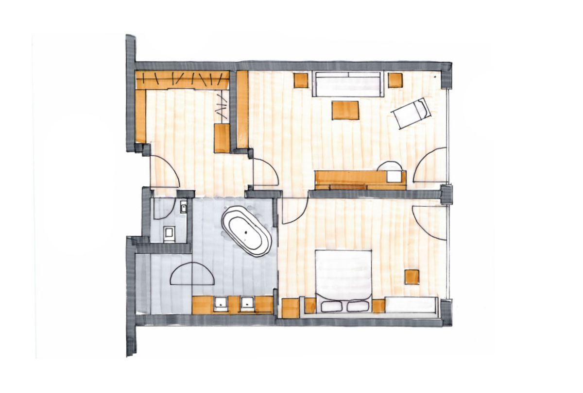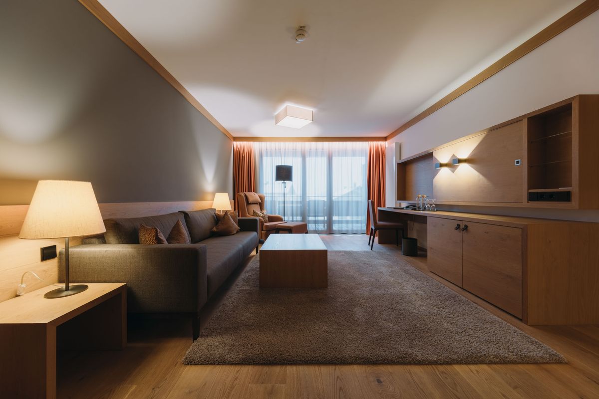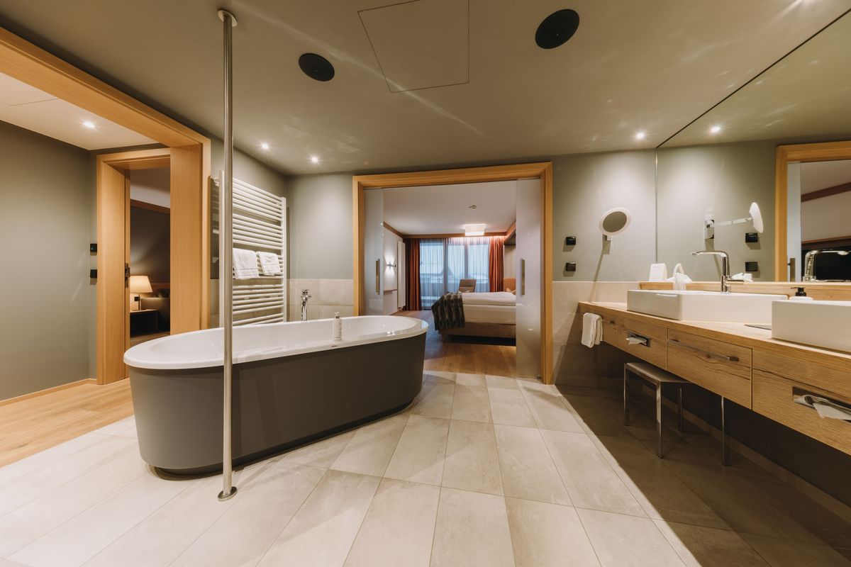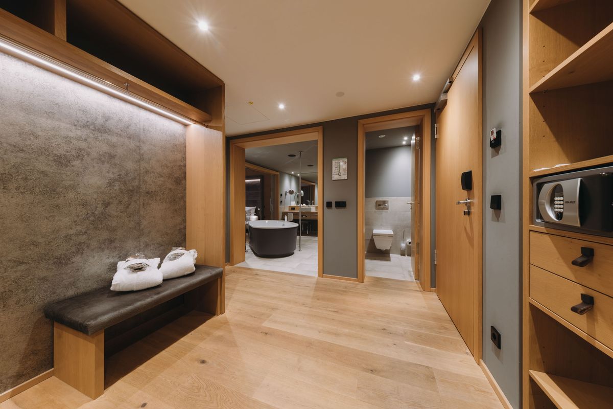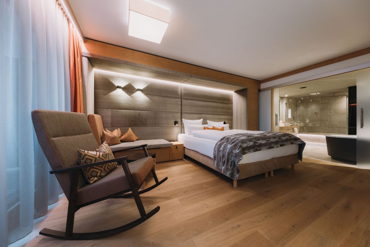 Modernes Interieur, edle Materialien und eine hochwertige Ausstattung machen diese 70 m² große Suite zu einem wahren Wohntraum in Südlage. Die in den Südhang gebaute Suite bietet auf dem Balkon Sonne, Ruhe und einen unvergleichlichen Blick auf die Allgäuer Berge. Großzügiges Schlafzimmer, separater Wohnraum, Eingangsbereich mit begehbarem Kleiderschrank sowie offenes Bad mit freistehender Wanne und Dusche schaffen ein luxuriöses Wohlfühlambiente.
