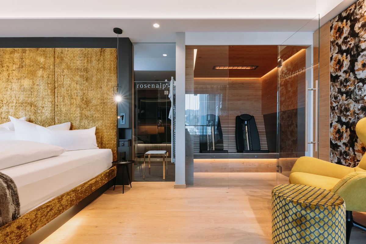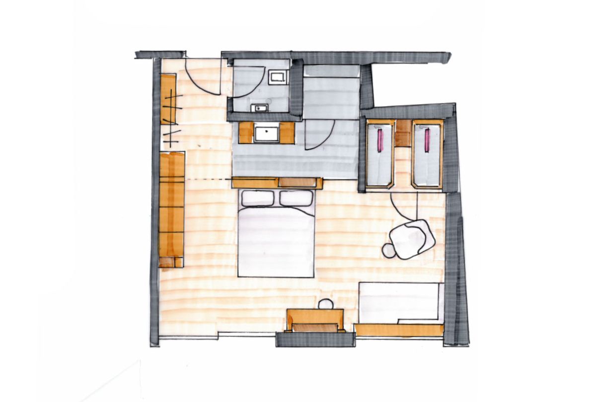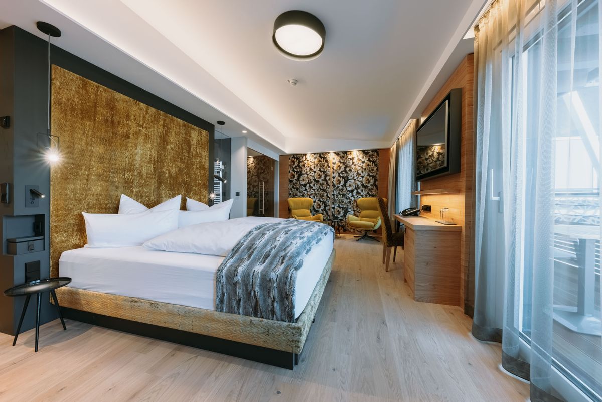 Edles Eichenholz, hochwertige Ausstattung und modernes Interieur machen dieses 52 m² große Doppelzimmer zu einem besonderen Rückzugsort. Der West-Balkon lädt ein, den Abendsonnenschein zu genießen, während das herrliche Wohlfühlambiente zum Entspannen und Erholen einlädt. Highlight: Ihre private Infrarot-Sauna für maximale Erholung.